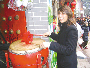 茱丽对中国传统文化很感兴趣。图为她在磁器口敲鼓。