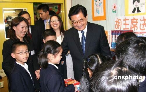 下午三时许,中国国家主席胡锦涛,来到这里了解海外华文教育的情况。当他步入三楼小三班的教室时,孩子们兴奋地鼓掌,欢迎这位经常在电视里看到的爷爷。