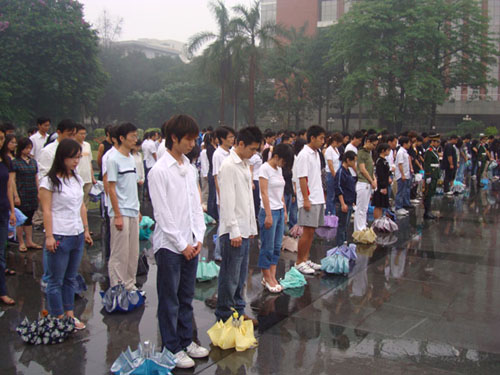 国务院公告发布后,暨南师生早早就行动起来,5月19日清晨6点45分,学校在图书馆广场举行降半旗仪式,为四川汶川地震遇难者致哀。数百名暨南师生怀着悲痛的心情,冒雨参加了仪式。