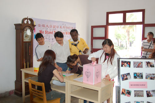 5月19日,安徽大学国际教育学院在学院一楼大厅举行了一场为四川地震灾区签名和募捐的活动。