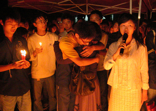 在七号篮球场,围绕着烛光拼成的“5.12”图案,上千名同学里三层外三层围成同心圆,共同为死难者默哀,为生者祈祷。