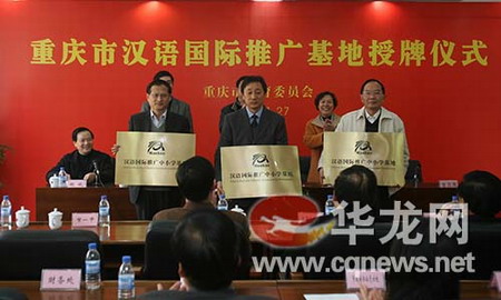 11月27日下午,国家“汉语国际推广中小学基地”和“重庆市汉语国际推广培训基地”授牌仪式在重庆市教委举行。重庆一中、八中、巴蜀中学、重庆市第二外国语学校、重庆清华中学5所中学被国家汉语国际推广领导小组办公室确定为“汉语国际推广中小学基地”,重庆师范大学被重庆市教委确定为“重庆市汉语国际推广培训基地”。