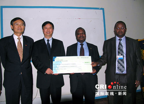 中国驻肯尼亚大使张明(左一)、中川公司董事长林斗明(左二)和内罗毕大学孔子学院院长姆贝齐出席捐赠仪式。(国际在线/谢意)