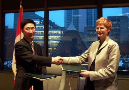 中国海外交流协会代表、文教部副部长雷振刚先生和多伦多市教育局代表、局长格里•康纳利女士分别代表各自机构签字并相互交换了协议文本。