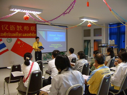 联谊会上,孔子学院中方院长介绍了2007年孔子学院汉语教学和文化活动的开展情况,并与教师们进行了深入交流与探讨。