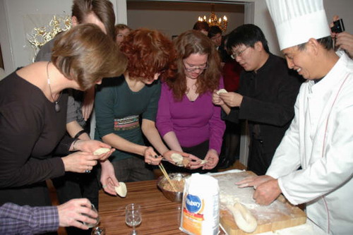 当晚的主题是“包饺子”,使馆厨师周政为大家现场展示中国新年的传统食品——饺子的制作步骤:和面、调馅、撵皮到包饺子。演示完毕,在大使的鼓励下,冰岛客人都来到展示桌前,拿起师傅撵好的皮,包起饺子来。场面顿时热闹起来。大家手法各异,有人包出非常地道的中国饺子,也有人独树一帜,开创“冰岛风格”的饺子。更有人不甘心只做包饺子这么简单的活,拎起擀面棒,做起饺子皮来。