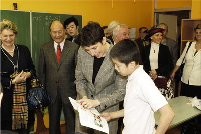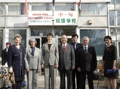 2月26日,双语学校的同学们在校门口向总理夫人敬献了鲜花,并用匈语欢迎总理夫人及贵宾们的到访。在随后举行的座谈中,双语学校校长琳德奈尔.古斯达夫妮向来宾详细介绍了学校成立至今的开办情况、教师的组成、中匈学生的入学比例和分班状况等;她认为中匈双语学校的开办是成功的,同学们从入学时不懂匈中文,到现在初步掌握了匈中文,同时还学习英语,取得了很好的成绩。她对中国政府和中国驻匈牙利大使馆对中匈双语学校的大力支持表示感谢,感谢匈政府对中匈双语学校的关注,感谢十五区区政府及各方面人士对双语学校的帮助。
