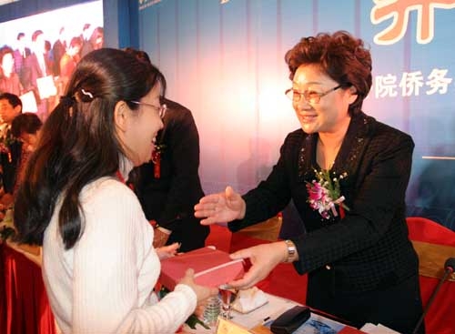 2007年11月,在青岛举办的“第五届国际华文教育研讨会”上,国务院侨办李海峰主任为参会的优秀海外华文教师颁授奖牌。(来源:中新社王海波)
