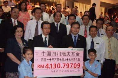 捐款仪式前,全场为地震罹难者默哀一分钟。魏家祥副部长和彭忠良总会长在讲话中表示,四川大地震牵动着马来西亚人民的心,特别是看到灾区很多学校瞬间夷为平地,天真可爱的孩子被深埋瓦砾之中,一位老师以生命为代价用身体掩护三名学生免遭不测,马来西亚人民和学校师生深受感动。马来西亚全国校长职工会在震灾发生后,立即发动西马半岛986所华文小学进行“一人捐一元”赈灾筹款活动,全国各地反响热烈,很多学生把自己的零用钱全部捐献给四川的学生,一些由于放假没来得及在学校捐款的学生随后通过其他社团捐款才得到安慰,在短短8天时间里筹集救灾善款4130797.09马币,约合884万元人民币,这是马华文学校历史上规模最大的募捐活动,创造了一个新的纪录。