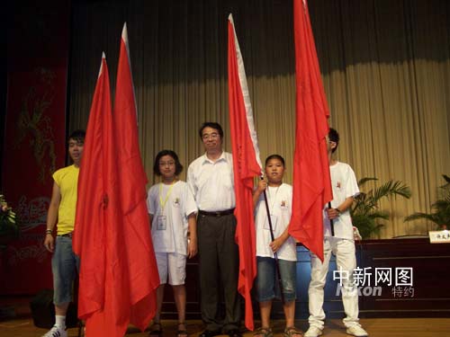 来自13个国家的温州籍华裔青少年“寻根之旅”夏令营7月12日在浙江温州开营,中国国务院侨办副主任许又声向营员授队旗,来自法国女生张小华在开营仪式上高呼:“CHINA,很帅。”