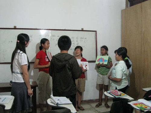 我们指导了两个汉语学习班,第一家学习班是由小孩子组成的。小孩们个个机灵活泼,见到中国老师,他们是那么的高兴。教他们的中文儿歌,不到十分钟就学会了。看着他们那一份对汉语的渴望与热情,我被感动了。第二家汉语学习班是由小学,初中到高中的学生组成。当中国老师给他们讲课时,他们是多么的认真,就连窗外的大雨声都夺不走他们的专注。我们在一起聊天时,才知道他们是从2003年就开始学汉语,一直坚持到现在。听学生代表讲话,我非常感动。正是那一份对汉语的坚持与执着使我感动。他们不怕风,不怕雨,不怕一切困难,一天又一天,一月又一月,一年又一年地坚持,这就是他们学习汉语的真实写照。它会让我铭记一生的。