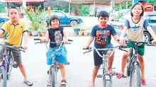 峇拉的女儿雅斯(右2)放学后,与华裔朋友一同踏脚车玩乐。(马来西亚《中国报》/黄慧艳)