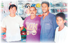 颜木财(左起)除了和峇拉是友好关系外,与该店店员也很要好。(马来西亚《中国报》/黄慧艳)