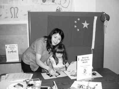 今天先是来了一批华裔小朋友,他们对北京奥运会徽和福娃的名字都比较熟悉,所以在互动环节,他们总能答对我的问题,这样每个人都高高兴兴地获得了小纪念品。他们每个人都用毛笔认真地练习着自己的中文名字。后来陆陆续续地又来了一些小朋友,他们很羡慕华裔小朋友有中文名字,也要求我给他们起中文名字,然后用毛笔写出来,他们再临摹。一位家长请我写下她的中文名字,然后又非常客气地请我在纸上写下她先生和她两个姐姐的名字。她说,他们虽然没有去过中国,但是很喜爱中国文化,家里的墙上挂着中国的毛笔字,但是不知道是什么意思。当我一一满足她的要求后,她一脸兴奋的表情,一遍遍地说着“Thank you”。后来又围上来一位年轻妈妈,头上严严实实地包着围巾(可能信奉伊斯兰教)。她拿出自己准备好的一张纸,指着上面的名字小声说“这是我的儿子,他有两个生日。”我一愣,原来她儿子不到1岁就死了,她的先生常常去中国做生意,她认为给儿子起个中国名字也是纪念儿子的一个方式。