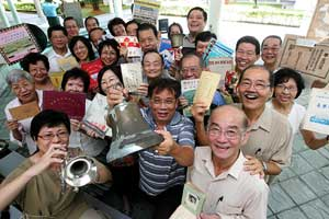 一群热心的老校友,把自己能找到的实物资料,统统拿来参加华校校史联合展。(新加坡《联合早报》/何炳耀)