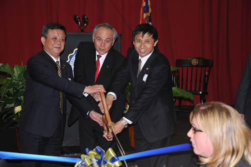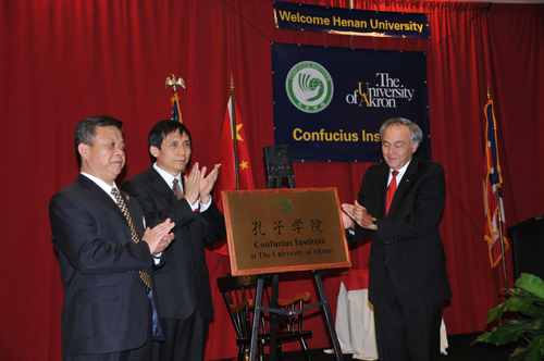 12时整,阿克伦大学孔子学院揭牌仪式正式开始。仪式由阿克伦大学第一副校长Dr. Elizabeth Stroble主持。阿克伦大学董事会主席Philip Kaufmann先生致欢迎辞,对河南省教育厅官员及河南大学代表团一行来访阿克伦大学表示了热烈的欢迎。随后,阿克伦大学校长Dr. Luis Proenza、河南大学校长关爱和、河南省教育厅副厅长訾新建、我国驻纽约总领馆教育一秘李国早、阿克伦市市长Don Plusquellic、俄亥俄州州长代表发展厅国际市场部部长Debrorah Scherer和教育厅代表Bill Russell先后发言。阿克伦大学校长Dr. Luis Proenza和河南大学校长关爱和均回顾了两校近十年来的友好交流情况,称孔子学院的建立进一步加强了两校的友好关系,是中美友谊的象征。希望通过孔子学院的平台,推动汉语和中国文化的传播,继续扩大和发展两校友好关系,增进两国人民的相互了解。双方校长还交换了礼物。随后,Dr. Luis Proenza、关爱和、訾新建共同为阿克伦大学孔子学院揭牌并剪彩,会场顿时响起了热烈的掌声。揭牌期间,阿克伦大学学生和市民还表演了太极拳等富有中国特色的文艺节目。