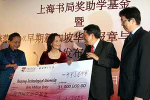 新加坡上海书局捐款100万元给南大中文系,成立“上海书局奖助学基金”,加上政府一元对一元的拨款使基金总数增加到200万元。