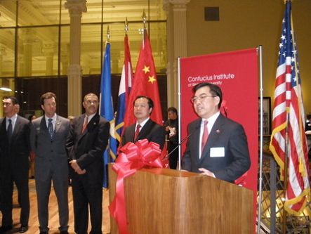 其它贵宾在讲话中表示,保持中美关系健康稳定发展,不断扩大双边在政治﹑经贸﹑文化和教育等领域的合作,有利于两国及两国人民的利益;中国政府批准在韦伯斯特大学建立孔子学院,这对于韦伯斯特大学是一个很高的荣誉,希望该孔子学院发挥好桥梁作用,积极促进密苏里州与中国在各个领域的交流与合作。