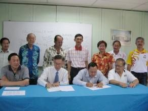 王坚前(坐者左2)李冠霖(坐者右2)共同签署合作办学协议书。(图片/《星洲日报》)