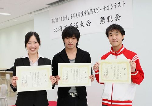 经过认真评议,北海商科大学四年级学生三瓶司真获得第一名;札幌大学四年级学生松尾辽平获得第二名;北海商科大学三年级学生大串多惠子获得第三名。其中,三瓶司真将被推荐给大赛组委会,以期代表北海道地区参加于今年7月在中国湖南举行的“汉语桥”世界大学生中文比赛复赛决赛阶段的比赛。