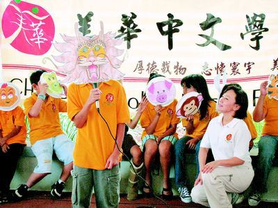 当日的节目精彩绝伦,不仅有七位身着台湾原住民传统服饰的非华裔小朋友演唱歌曲《站在高岗上》、还有二年级学生表演背诵《三字经》、三年级学生戴着动物面具,轮番接力说十二生肖的故事。高年级班还特别以说故事及男女合作的歌舞来呈现他们的学习成果。
