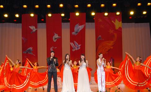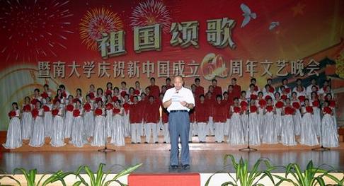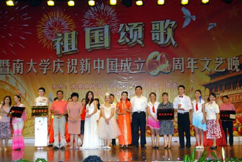 9月28日晚,红旗飘扬,掌声阵阵,由暨南大学校党委宣传部、学生处、教育工会、团委联合主办的“祖国颂歌——暨南大学庆祝新中国成立60周年文艺晚会”在暨大礼堂隆重举行,各学院、机关部处的表演队伍和教工、学生艺术团一道,用动听的歌声、欢快的舞蹈、铿锵的朗诵抒发对祖国母亲的最美祝福。学校领导蒋述卓、纪宗安、叶勤、刘洁生、林如鹏、校长助理王志伟和1700多名师生观看了晚会。晚会同时视频直播。