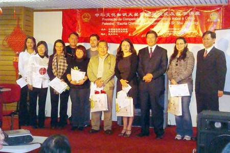 此次中华文化知识大奖赛是由中国驻巴西大使馆文化处和华光语言文化中心主办,圣保罗亚洲文化中心协办的。据负责这次活动的华光语言文化中心副校长梁雁说:“组织中华文化知识大奖赛,参赛对象是巴西学生,对华光语言文化中心来说还是第一次,虽然报名时间只有短短的两个星期还是有50多名学生报名参加,显示出了巴西学生的浓厚兴趣”。考试是在9月25号举行的,经过激烈角逐,分别评选出一、二、三等奖。中国驻巴西大使馆文化参赞舒建平、华光语言文化中心校长齐耀斌、副校长梁雁向荣获前三等奖的学生颁发了奖状和奖品,并与他们合影留念。