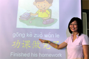 英华学校(附小)母语部主任赖俊方在上华文课时,采用双语教学。
