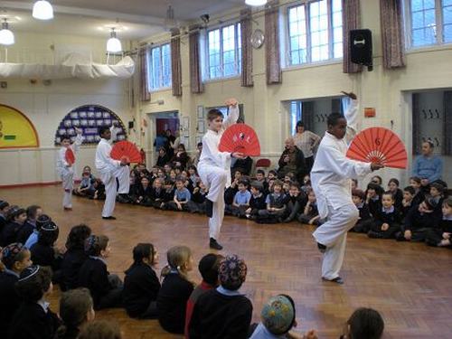 近日,英国金斯福德社区学校孔子课堂的学生们来到位于伦敦北部的Wolfson Hillel小学,开展中国文化宣传活动。这是该校“中国周”活动的一部分。全校约500名师生参加。