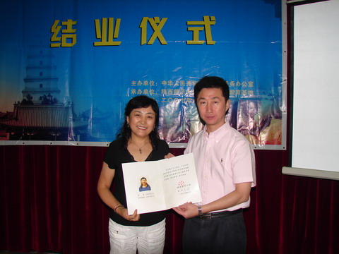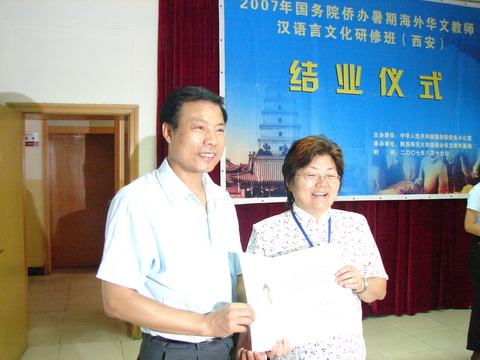 8月16日下午,“2007年海外华文教师汉语言文化研修班”结业仪式在该校国际汉学院隆重举行。国侨办文宣司副司长雷振刚、陕西师范大学副校长张建祥、国侨办文宣司华文教育处处长邱立国、国际汉学院有关负责人及来自美国、法国、德国、加拿大等发达国家的海外从事华文教育的教师共计20余人出席了结业仪式。