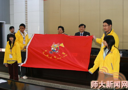 仪式上,阳春娥和湖南师范大学副校长蒋洪新亲手将营旗授给冬令营。