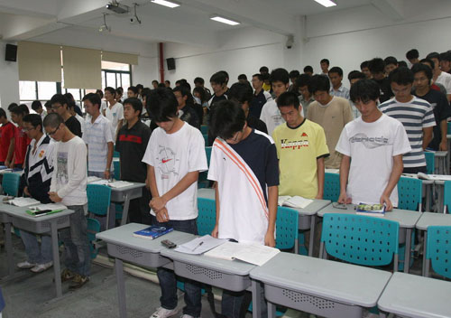在数学楼梯形教室,数学科学学院全院学生在“心”形烛光的映照下,起立为汶川大地震死难同胞默哀3分钟。广大师生还齐声高唱《爱的奉献》,并以写卡片的方式为受难同胞送上自己的慰问与祝福。该院2005级澳门学生何佳俊说:“尽管地震的苦难我们无法感同深受,但可以付出我们的真情。大家都要积极向前,与无情的灾难对抗到底。”