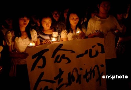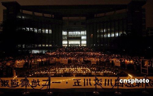 仪式结束后,聚集的学生依然久久不愿离去,有同学大声呼喊:“四川雄起”,“中国加油”,有人唱起《明天会更好》,更多的人静静围着风中摇曳的烛光,心中默默祈祷,让烛光照亮逝者归去的路……
