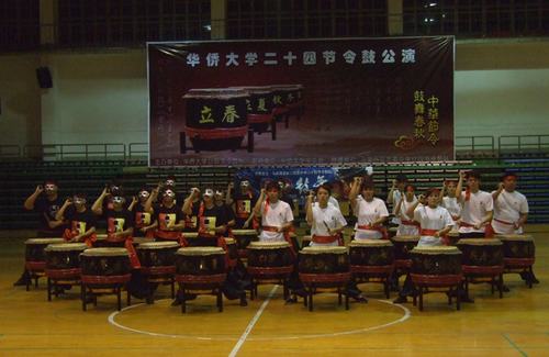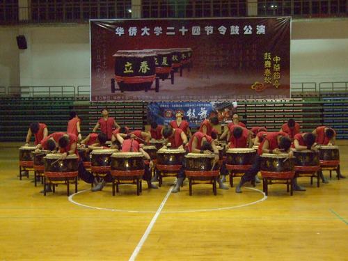 以“中华节令 鼓舞春秋”为主题的华侨大学廿四节令鼓公演1日晚在华侨大学李回咤体育馆举行。华侨大学副校长吴季怀到场观看演出并致辞,欢迎廿四节令鼓创始人陈再藩和马来西亚宽柔中学廿四节令鼓队访问华大。他称,廿四节令鼓是一种艺术,一种文化,更是一种力量,他鼓励大家用激昂的廿四节令鼓为遭受5.12震灾的四川同胞呐喊加油。