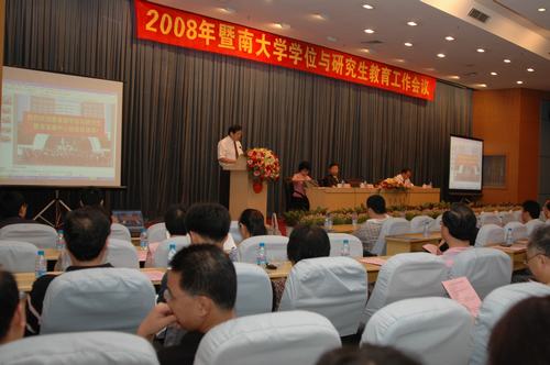 胡军校长首先致辞。他简要回顾了我校改革开放30年以来研究生教育的历史和丰硕成果,总结了学校研究生教育改革的经验,介绍了学校积极推进的研究生院申报工作的情况,并对即将开展的我校学位与研究生教育工作会议寄予了殷切期望,他希望大家解放思想,探索新路子,提出新办法,总结出超前的人才培养新模式,创造暨南大学的高层次人才培养的新局面。