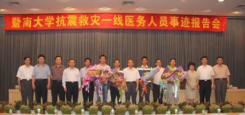 6月5日下午2:30,由暨南大学党委宣传部、党办•组织部、校行评办主办的暨南大学抗震救灾一线医务人员事迹报告会在曾宪梓科学馆国际会议厅举行。暨南大学附属第一医院参加汶川一线抗震救灾的林永新、刘宁医生作事迹报告,附属第一医院黄力院长汇报医院参加抗震救灾的情况。校领导蒋述卓、贾益民、陆大祥、纪宗安、叶勤以及参加一线抗震救灾的陈祖辉、赖睿佳、曾来针、李斌与学校各机关部处、直属单位400余名师生代表参加了报告会。报告会由贾益民副校长主持,蒋述卓书记作总结发言。报告会同时在网上视频直播。会议前,全场为四川汶川遇难同胞默哀一分钟。