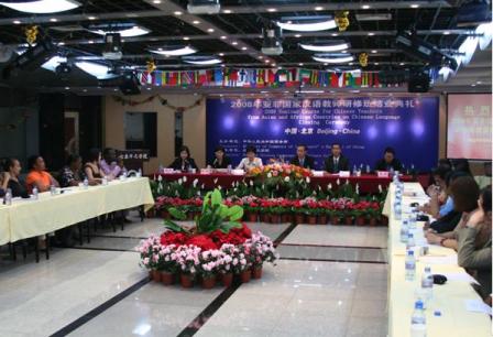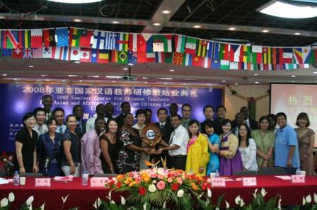6月18日上午,由国家商务部主办,北京华文学院承办的“2008年亚非国家汉语教师研修班”结业典礼,在北京华文学院沐彬厅举行。国务院侨办人事司副司长王萍、北京华文学院院长彭俊、国家商务部国际经济事务合作局培训处副处长樊金科、项目主管姜灏,以及北京华文学院援外培训中心主任陈默、各位授课教师参加了结业典礼。