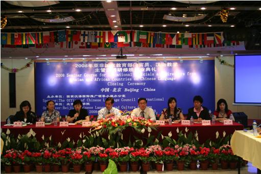 6月14日,“2008年亚非国家教育部门官员、汉语教学主管汉语研修班”结业典礼在北京华文学院沐彬厅举行。结业典礼由援外培训办公室主任陈默主持,国家汉语国际推广领导小组办公室重大项目与交流处处长王鲁新、北京华文学院院长彭俊出席了结业典礼。