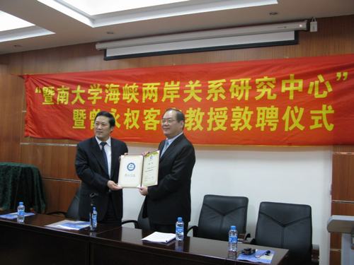 胡军校长与曾永权先生为中心的成立致贺辞,并一起为中国国民党荣誉主席连战亲笔题写的“暨南大学海峡两岸关系研究中心”牌匾揭牌。揭牌仪式后,胡军校长为曾永权先生颁发了“暨南大学客座教授”聘书。