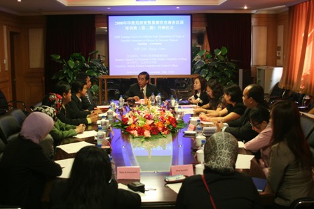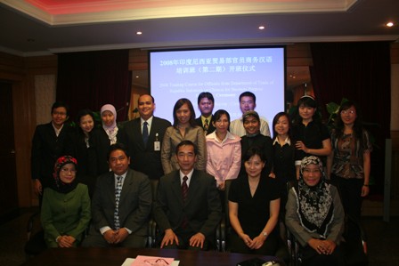 9月18日上午,2008年印尼贸易部门官员商务汉语培训班(第二期)开班仪式在北京华文学院举行。这次研修班由中国商务部主办,北京华文学院承办。北京华文学院院长彭俊,援外培训中心主任陈默,教学负责人王庆芳以及授课教师参加了开班仪式。