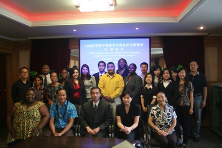 彭俊院长在开班仪式上致词,对各国学员表示热烈欢迎,并指出中国和发展中国家有着共同的国际利益,通过这次研修班,可以促进中国和发展中国家人民之间的相互了解,建立更深、更广的友谊。来自萨摩亚的托马斯先生作为学生代表讲话,他表示自己非常珍惜这次学习的机会,希望通过此次学习,能够熟练运用汉语、了解中国文化,成为一名加深中萨友好关系的使者。他代表所有学员对中国政府提供的这次学习汉语、了解中国文化的机会表示由衷的感谢。教师们与学员们在热烈友好的气氛中进行交流,并合影留念。