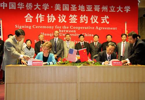 中国华侨大学与美国圣地亚哥州立大学11月1日下午在陈嘉庚纪念堂科学厅签署合作协议。华侨大学校长吴承业与圣地亚哥州立大学执行校长南茜·玛兰分别代表两校在合作协议书和学生交换协议书上签字。华侨大学副校长张禹东主持签约仪式。