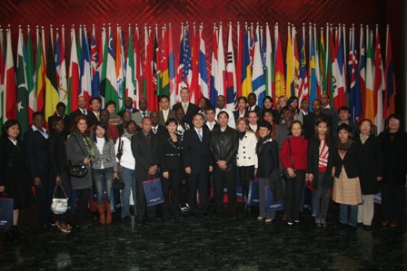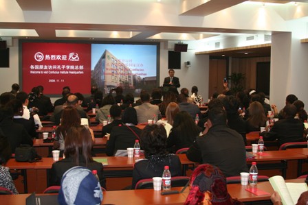 11月11日下午,来自巴哈马、尼日利亚、利比里亚、菲律宾、巴勒斯坦、罗马尼亚、保加利亚、老挝、秘鲁等48个国家的110名学员,在北京华文学院院长彭俊,援外培训中心主任陈默,教学负责人王庆芳以及授课教师的带领下参观了国家汉办、孔子学院总部。