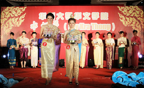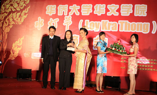 华侨大学华文学院迄今为止已成功举办三届水灯节。今年的水灯节庆典活动是有史以来规模最大的一次,共有来自中国、印尼、加拿大、日本和马来西亚等国的12名佳丽从众多选手中脱颖而出参加本届水灯小姐的评选活动。11月21日晚7点,华文学院在南门广场举办大型水灯节晚会,全院师生共庆水灯节。泰王国驻厦门总领事馆领事Ti wegeek携夫人以及领事馆其他嘉宾莅临本场晚会。华侨大学学生处处长陈国柱,副处长陈荣美,华文学院副院长陈旋波,党总支副书记张灯,副院长李晓洁以及学院其他领导、老师出席了本场晚会。