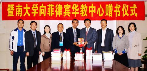 11月27日下午,暨南大学举行向菲律宾华教中心赠书仪式,副校长林如鹏出席并向菲律宾华教中心主席、菲律宾侨中学院校长颜长城先生及菲律宾广东侨团总会名誉理事长黄锡堃先生赠送了一批暨南大学出版社出版的中文读物、音像制品。出版社社长徐义雄、副主编李战等参加了赠书仪式。招生办公室主任庄友明主持了仪式。