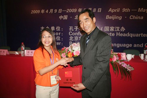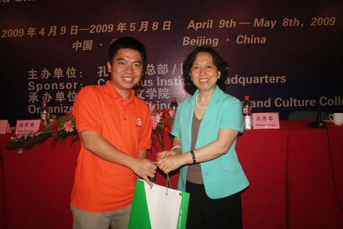 结业典礼上,北京华文学院院长彭俊博士致辞,对各国学员的顺利结业表示衷心的祝贺,感谢各国学员把本国的语言和文化带来与大家一起分享,希望学员们回国后能将所学的知识运用到教学和工作当中,成为传播中国文化的友好使者。各国学员代表一一发言,对国家汉办、国务院侨办、北京华文学院领导的关心和各位老师的努力工作表示由衷的感谢。他们认为这次培训很成功,很有收获,并表示这次培训虽然已经结束,但是学习仍会继续,同时表达了希望再来北京华文学院学习的强烈愿望。 国家汉办师资处处长杨金成先生和北京华文学院院长彭俊博士分别为学员颁发了汉语教师培训证书和北京华文学院学习证书。