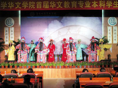 6月22日晚,华文学院在暨南大学管理学院礼堂举行了首届华文教育专业本科毕业生晚会。国务院侨务办公室文化司高教处调研员别林业、菲律宾华教中心主席颜长城、印尼雅加达华文教育协调机构、印尼全国华教联合秘书处执行主席蔡昌杰、柬埔寨柬华理事总会文教处副处长谢进群、老挝万象中华理事会秘书长彭正华等领导、嘉宾及华文学院郭熙院长、曾文明书记等院系领导、教师出席并观看了晚会。此外来自世界各地的200余名学生和50多位毕业生家长、亲朋参与了晚会。