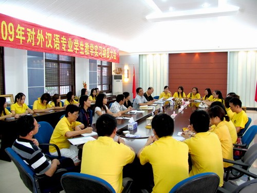 10月9日下午,华侨大学华文学院举行了2009年对外汉语专业学生赴泰国参加“中华文化大乐园”教学实习动员会。华大华文学院副院长陈旋波、副书记张灯、副院长李晓洁以及5位部门领导和24名对外汉语专业学生参加大会。会议由华文系主任胡培安主持。