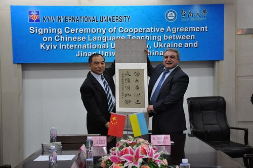 受校长胡军的委托,暨南大学副校长贾益民于9月29日下午代表学校与乌克兰基辅国际大学校长哈恰图良签署了两校汉语教学合作协议书。在签字仪式上,贾益民向来宾介绍了暨大的办学情况,并讲解了该校在办学过程中形成的一整套,从教学、科研、教材编写到海外教育项目开发的对外汉语教学办学体系,暨南大学很乐意以优质的教学资源为有需要的国家提供汉语教学支持。哈恰图良对暨大的热情接待表示感谢,他盛赞中国是一个具有悠久历史和文化传统的伟大国家,汉语热在世界范围内的兴起就是最好的佐证。目前乌克兰对汉语的需求很旺盛,学习汉语的人也越来越多,希望暨南大学在教学、师资等方面给予支持,全力推动乌克兰的汉语教学工作。双方签署正式协议后将在建立汉语教学点、联合培养研究生、互相协助招生等方面开展实质性合作。