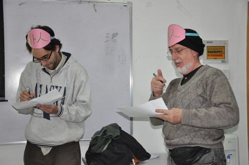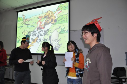 接着,在趣味盎然的成语再现环节中,中外学生分成六组分别即兴表演了小话剧。各组的表演风格各异:有的擅于说理,只用简单的道具就把故事讲述的井井有条;有的创新地在故事中加入搞笑台词,他们声情并茂的表演博得了观众热烈的喝彩和掌声。通过成语再现环节,留学生对于那些看似艰涩的成语有了深刻理解,而且从中获得了交流的乐趣。在场的学生评委还对留学生的精彩表演进行评分,评出最佳表演奖、最佳配合奖、最佳台词奖、最佳人气奖等奖项,并颁发了的精美的中国剪纸和皮影作为奖品。